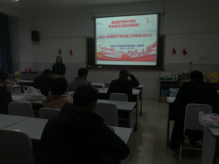 会议伊始,刘谭明副书记介绍了2018年12月份至2019年1月份的党建工作重要任务。然后,黄菊芳书记带领各支部书记学习了支部工作条例的主要精神,黄书记强调党支部是党的基础组织,是党在社会基层组织中的战斗堡垒,要求各支部组织党员认真学习支部工作条例,充分意识到党支部的职责和任务,完成好党支部的各项工作,发挥好党支部的作用。接着,专职组织员肖雪珍针对组织部的近期需展开的工作做了详细说明,获得了全体支部书记的理解和配合。最后进行了培训班测试。