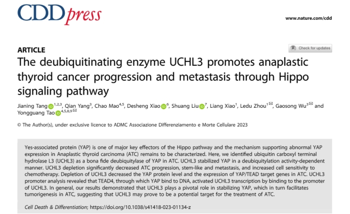 2日22日,bv伟德国际1946基础医公司肿瘤研究所陶永光研究员与湘雅医院肝脏外科周乐杜教授团队合作在国际著名期刊《Cell Death & Differentiation》(IF=12.07)以论著形式在线发表了题为“The deubiquitinating enzyme UCHL3 promotes anaplastic thyroid cancer progression and metastasis through Hippo signaling pathway(去泛素化酶UCHL3通过Hippo通路促进甲状腺未分化癌进展及转移)”的原创性研究。周乐杜教授、陶永光研究员以及武汉大学吴高松教授为本论文的共同通讯作者,bv伟德国际1946博士后汤佳宁为论文第一作者。本研究得到了基础医公司肖德胜教授、湘雅医院刘双研究员的大力支持。