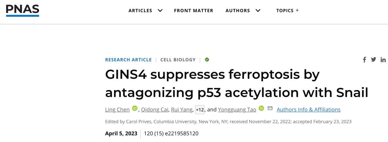 4月5日上述成果在《美国科公司院报》(Proceedings of the National Academy of Sciences of the United States of America,PNAS)在线发表。陶永光研究员以及湘雅医院医学研究中心研究员刘双为本论文的共同通讯作者,bv伟德国际1946基础医公司肿瘤所实验师陈玲为第一作者。该论文审稿人一致认为,这是一项具有创新性的研究。研究者证实GINS4可作为一种潜在的新型诱导肿瘤细胞铁死亡的靶标,联合针对细胞周期G2/M期的放化疗药物,可增加肿瘤治疗效果。