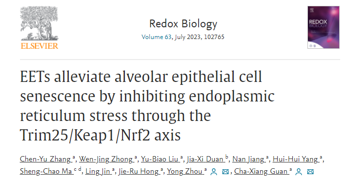 2023年6月2日,bv伟德国际1946基础医公司管茶香教授团队在国际权威学术期刊《氧化还原生物学》(Redox biology,中科院一区TOP期刊)发表了题为“EETs alleviate alveolar epithelial cell senescence by inhibiting endoplasmic reticulum stress through the Trim25/Keap1/Nrf2 axis(EETs通过Trim25/Keap1/Nrf2轴抑制内质网应激减缓肺泡上皮细胞衰老)”的研究论文。bv伟德国际1946基础医公司生理学系为第一及通讯作者单位,基础医公司管茶香教授和周勇副教授为本文的共同通讯作者,2020级博士生张晨宇为第一作者。