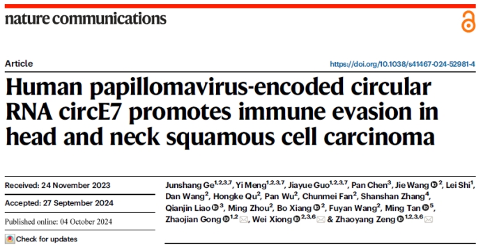 近日,bv伟德国际1946基础医公司肿瘤研究所曾朝阳、熊炜联合湘雅二医院口腔医学中心龚朝建在Nature Communications杂志发表了题为“Human papillomavirus-encoded circular RNA circE7 promotes immune evasion in head and neck squamous cell carcinoma”(人乳头瘤病毒编码的环状RNA circE7促进头颈鳞癌免疫逃逸)的研究论文。该研究发现人乳头瘤病毒(Human papillomavirus, HPV)通过编码环状RNA circE7,下调免疫检查点分子Galectin-9的表达,促进头颈部鳞状细胞癌(head and neck squamous cell carcinoma, HNSCC)免疫逃逸的新机制,并基于该发现提出了TIM-3 (Galectin-9在T细胞上的受体)单抗与现有PD-1单抗联合使用提高头颈鳞癌免疫治疗效果的新思路。