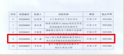 近日,湖南省自然科学基金委公布2025年度青年员工基础研究项目立项结果,公司周艳宏研究员指导的2023基础医学专业本科生袁一鑫同学所申报项目《Fra-1通过招募BRD4激活PD-L1表达促进胃癌免疫逃逸的机制研究》成功立项。这标志着公司在本科生科研能力培养方面取得的又一项突破,具有重要意义