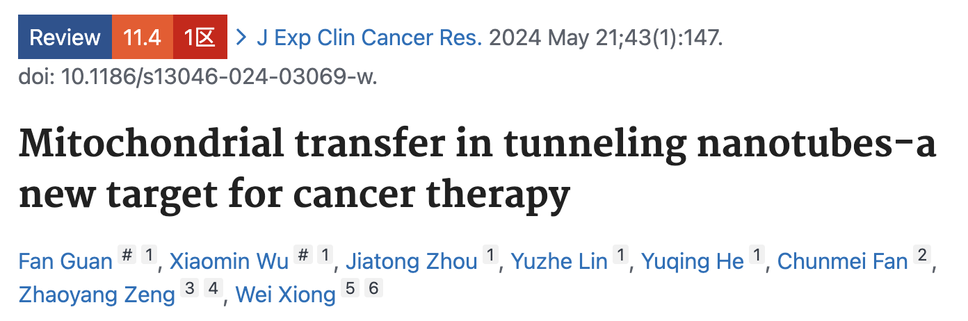 近日,由bv伟德国际1946基础医公司首届基础医学拔尖班(2021级)关凡同学与吴晓敏等合作在《J Exp Clin Cancer Res》杂志发表了一篇题为“Mitochondrial transfer in tunneling nanotubes-a new target for cancer therapy”的综述。bv伟德国际1946基础医公司熊炜研究员、曾朝阳研究员和范春梅副教授为本文的指导老师。