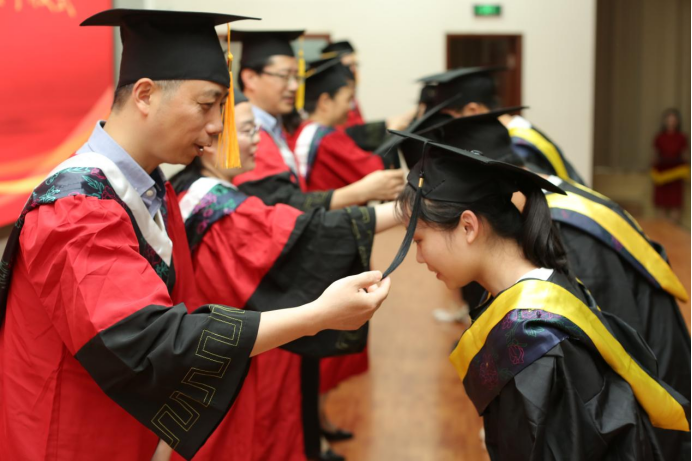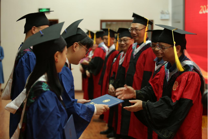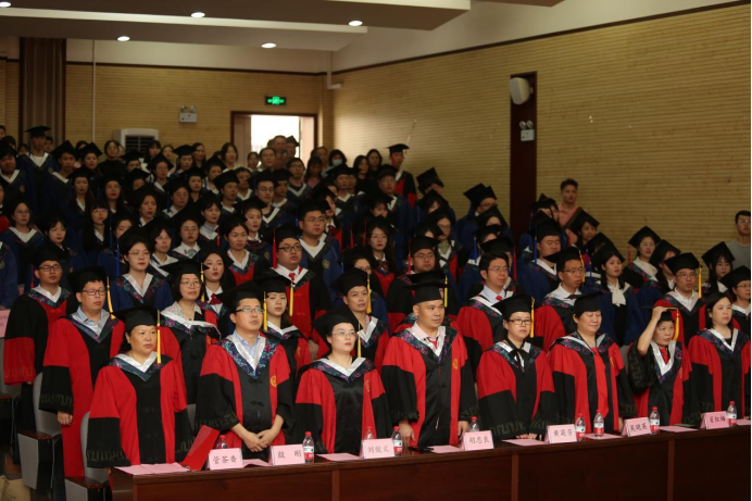 王慷慨副经理宣读公司学位评定委员会决议:66人获学士学位,90人获硕士学位,38人获博士学位。院领导和导师代表为获得学位的毕业生代表正冠拨穗,颁发学位证书。
