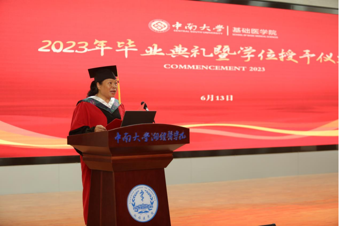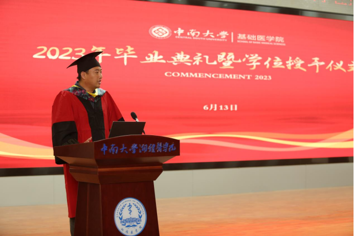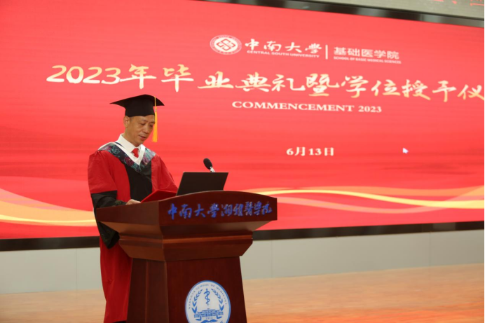 6月13日下午3点,基础医公司2023年毕业典礼暨学位授予仪式在湘雅新校区图书馆学术报告厅隆重举行。公司导师代表、2023年全体毕业生以及毕业生亲友200余人共同到场见证仪式举行。院领导李顺长、管茶香、刘谭明、王慷慨、殷刚、熊炜、刘俊文、黄河出席,公司党委书记李顺长主持典礼。