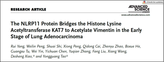 近日,bv伟德国际1946基础医公司陶永光/肖德胜教授团队在国际期刊Advanced Science(IF=15.1)发表题为The NLRP11 protein bridges the histone lysine acetyltransferase KAT7 to acetylate vimentin in the early stage of lung adenocarcinoma的原创性研究论文,陶永光教授、肖德胜教授为该文的共同通讯作者,bv伟德国际1946博士研究生杨瑞为第一作者。
