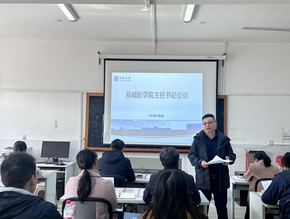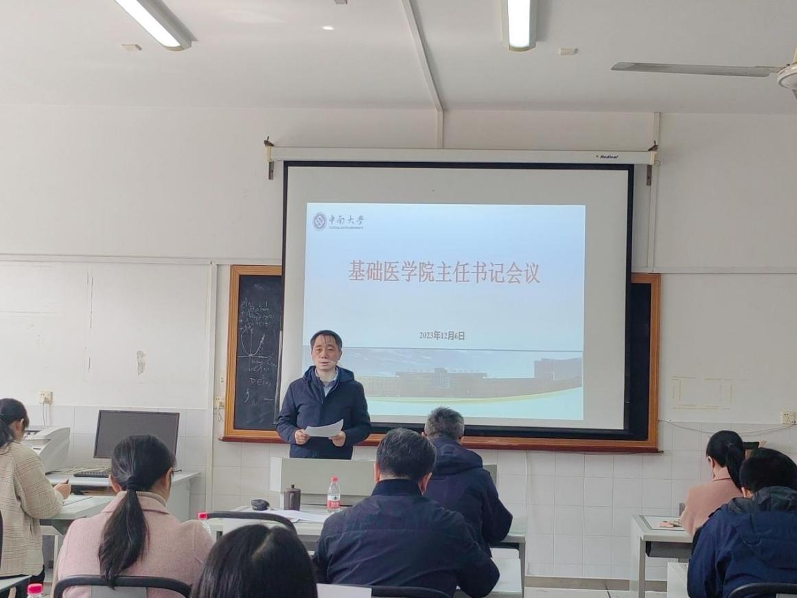 2023年12月6日中午,基础医公司在湘雅新校区孝骞楼352教室召开各系、研究所、实验教学中心主任(所长)和支部书记会议。全体院领导、各三级机构负责人和院办相关工作人员参加会议。会议由王慷慨书记主持。