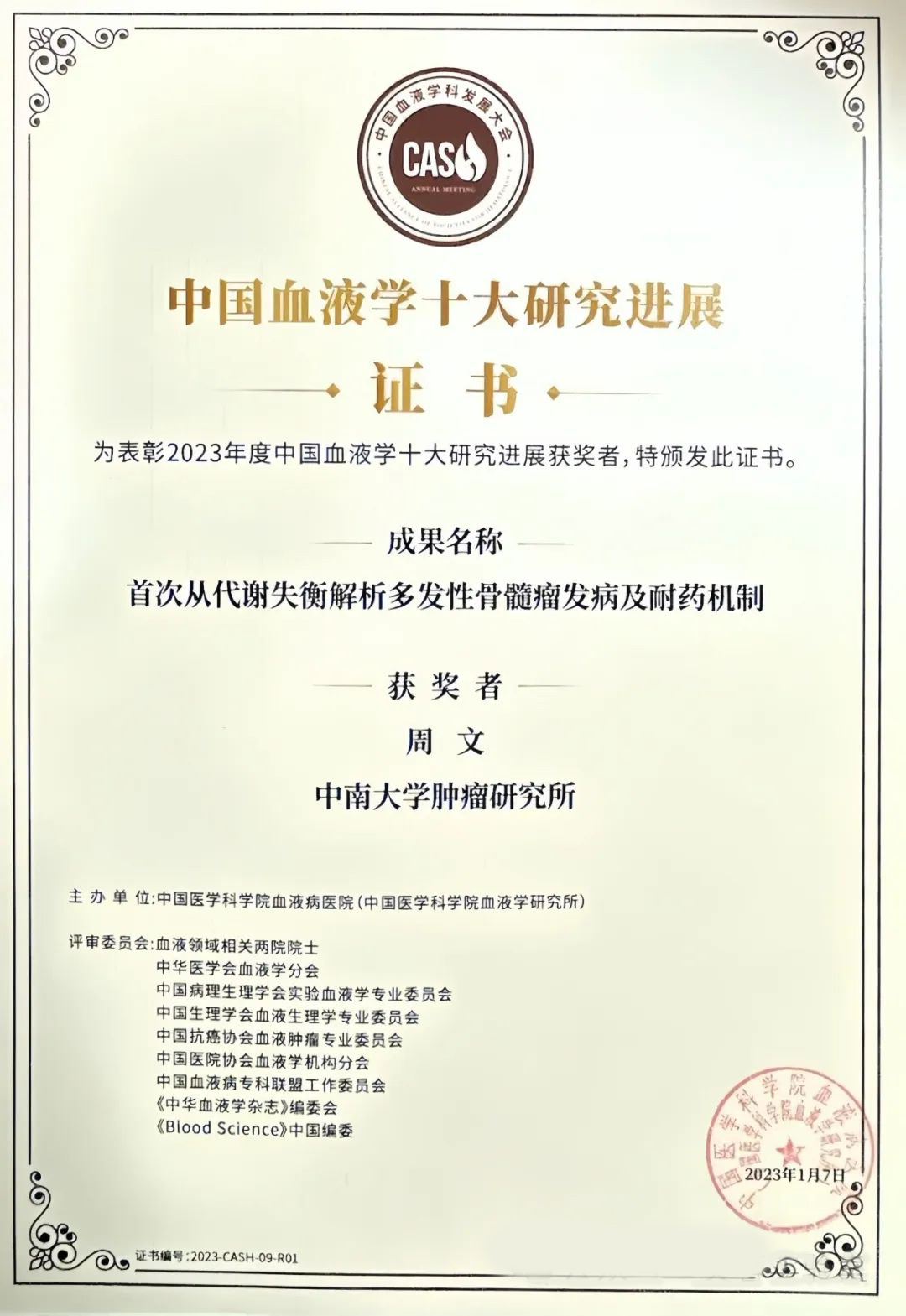 公司周文教授及其合作团队成果入选“2023年度中国血液学十大研究进展”