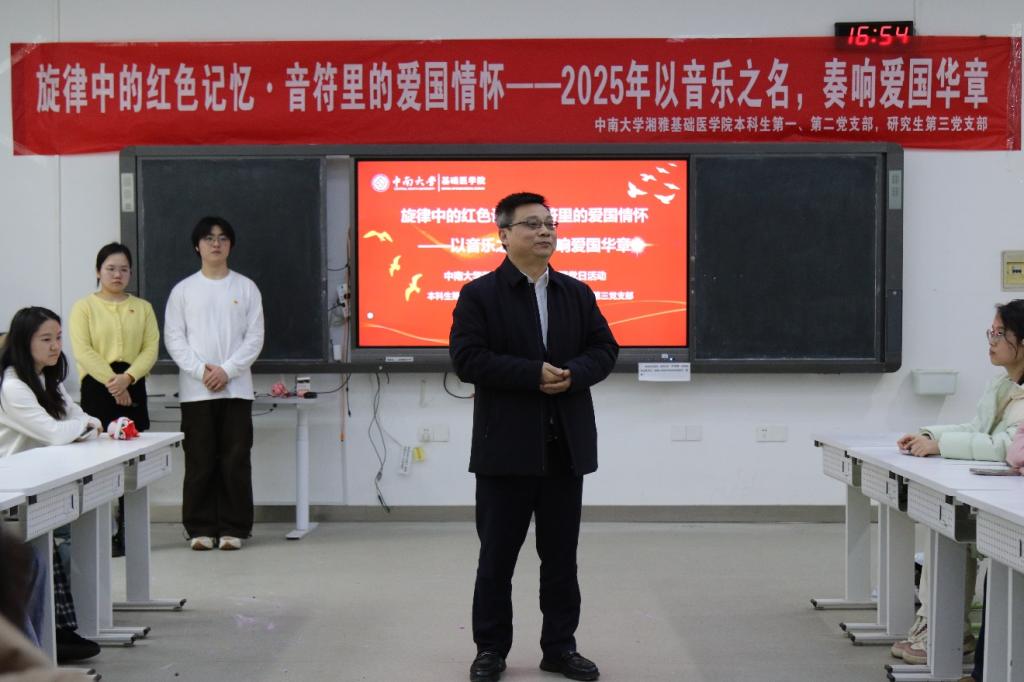 接近活动尾声,湘雅基础医公司王慷慨书记总结讲话,“在年轻人面前,我是一位‘长辈’。很多国家发展的经历是你们未曾体会的。今天的活动以‘以音乐之名,奏响爱国华章’为主题,用音乐串联起百年来中国人民在党的领导下,为民族独立、国家富强和人民幸福不懈奋斗的光辉历程。希望通过此次活动,激发大家内心深处的民族意识与情感共鸣。勿忘初心,不忘历史,让我们的心灵穿越时空,与那些为国家和民族牺牲的先辈们产生共鸣,感受他们对祖国深沉而炽热的爱。希望同学们以音乐为伴,以爱国为魂,为实现个人梦想与中华民族伟大复兴而努力奋斗。在新的一年里,祝愿大家学业进步、工作顺利、生活幸福!”