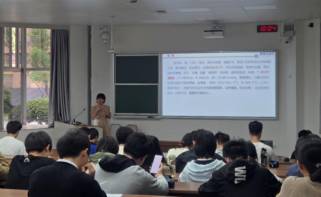 本次课堂采用基于SPOC的线上线下混合式教学模式,以"临床案例导入-科学史贯穿-价值观引领"为清晰主线,实现了专业知识与价值塑造的自然统一。蒋碧梅教授以一例社区获得性肺炎伴发热患者的诊疗过程为切入点,通过设置“发热是否需要使用抗生素”、“发热是敌是友”等课前思考题,启发员工从“稳态失衡与调节”、“损伤与抗损伤”、“局部改变与全身反应”等视角深入剖析发热的规律和本质,强化员工的辩证思维,树立员工的大健康观。课堂内容环环相扣,在探讨发热的病因、机制、功能代谢变化与防治原则的同时,有机融入了中国科学家在该领域的重要贡献,不仅培养了员工的科学创新思维,更极大地激发了其民族自豪与文化自信。课堂气氛活跃,师生互动频繁,思政元素如盐化水,润物无声,实现了价值引领的“浸润式”体验。