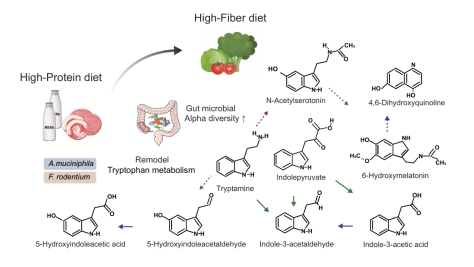 饮食与肠道微生物之间的相互作用是研究微生物和机体健康关系中的重要内容。尽管以往的研究发现不同饮食干预对肠道微生物组成和代谢物谱的影响,但对于饮食转变过程中肠道微生物群结构、功能潜能以及饮食变化下的微生物影响的代谢通路的具体变化仍不明确。本研究基于多组学整合分析,系统揭示了高蛋白饮食到高纤维饮食转变下肠道微生物群落结构和代谢通路的动态相应机制。结果显示,高蛋白饮食可显著降低菌群多样性并扰乱代谢稳态,而高纤维饮食可有效恢复微生态平衡,促进与健康相关的色氨酸及糖代谢通路活化。研究还发现,Akkermansia muciniphila 与 Faecalibaculum rodentium 为这一过程中的关键响应菌种,在饮食调节与代谢重塑中发挥重要作用。该成果为阐明“饮食—微生物—代谢”相互作用机制提供了新思路,对个体化营养干预与代谢性疾病防控具有重要科学意义。