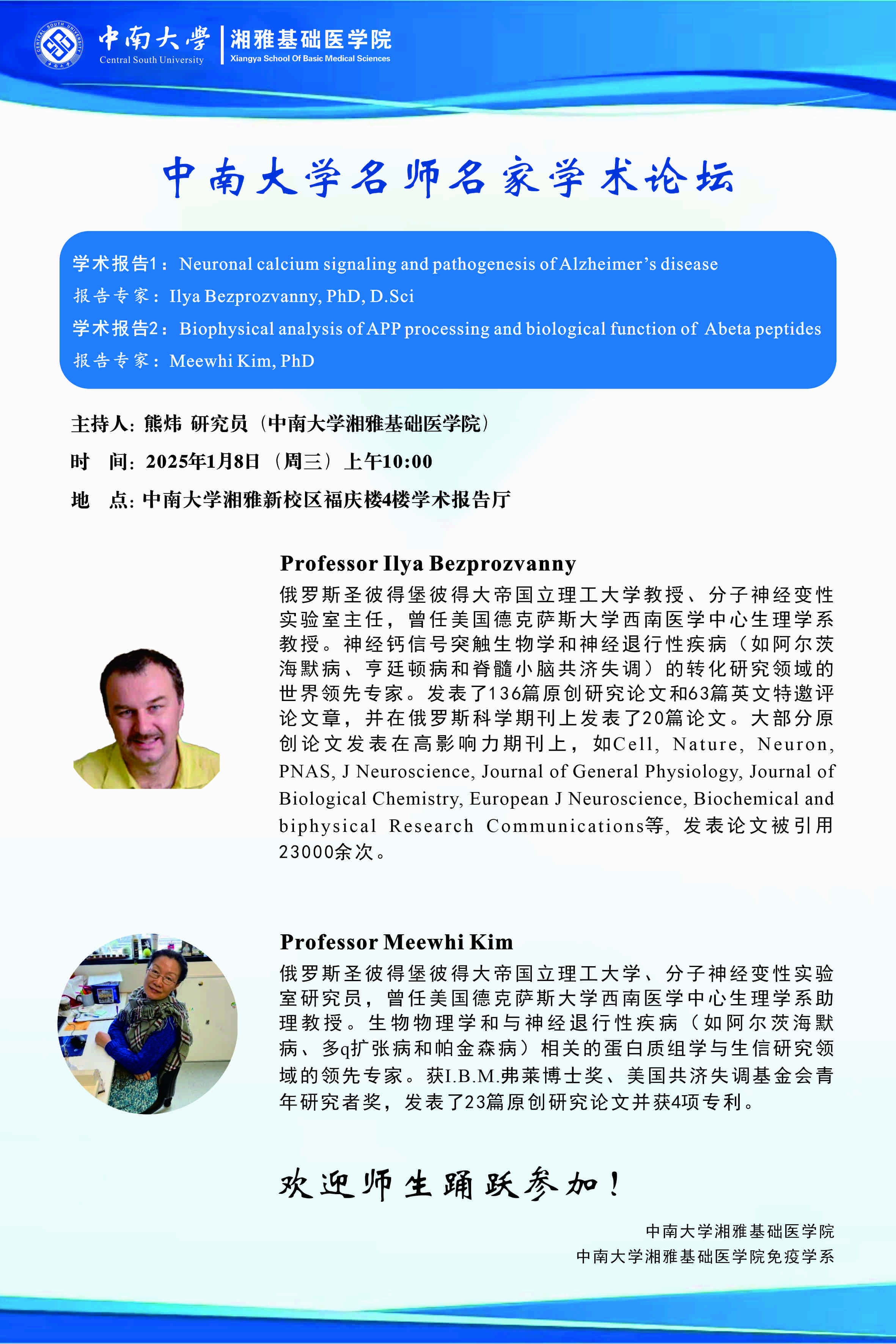 Ilya Bezprozvanny,Meewhi Kim bv伟德国际1946湘雅新校区福庆楼4楼学术报告厅 2025年01月06日 10:54 浏览次数: