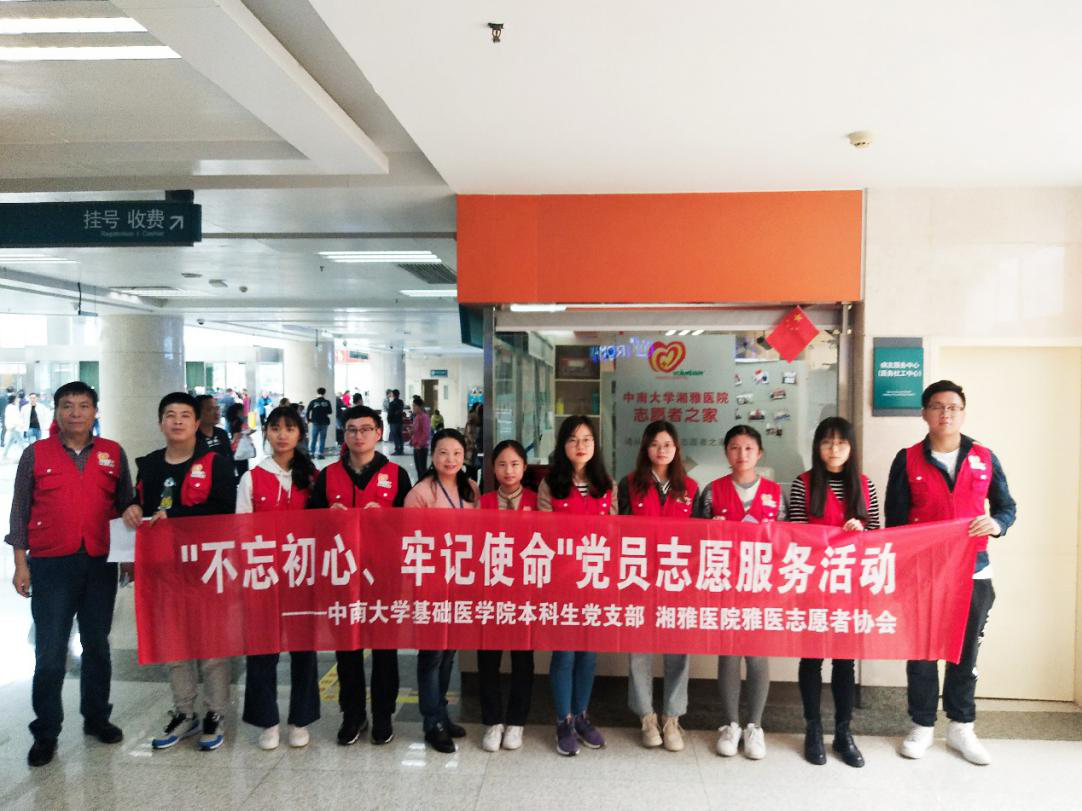 2019年10月24日、25日,基础医公司本科生党支部联合湘雅医院雅医志愿者协会,在bv伟德国际1946湘雅医院开展了“不忘初心、牢记使命”党员志愿服务活动,支部共有18名党员分两批次参加了此次活动。